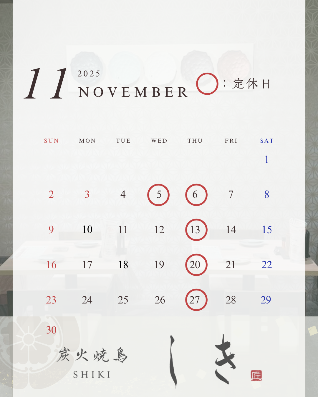 11月、定休日のお知らせ 2025年11月1日 最終更新日時 : 2025年11月1日 しきオーナー焼き鳥 お世話になっております。 11月は5日(水)が臨時休業となります。 宜しくお願い致します。 カレンダー